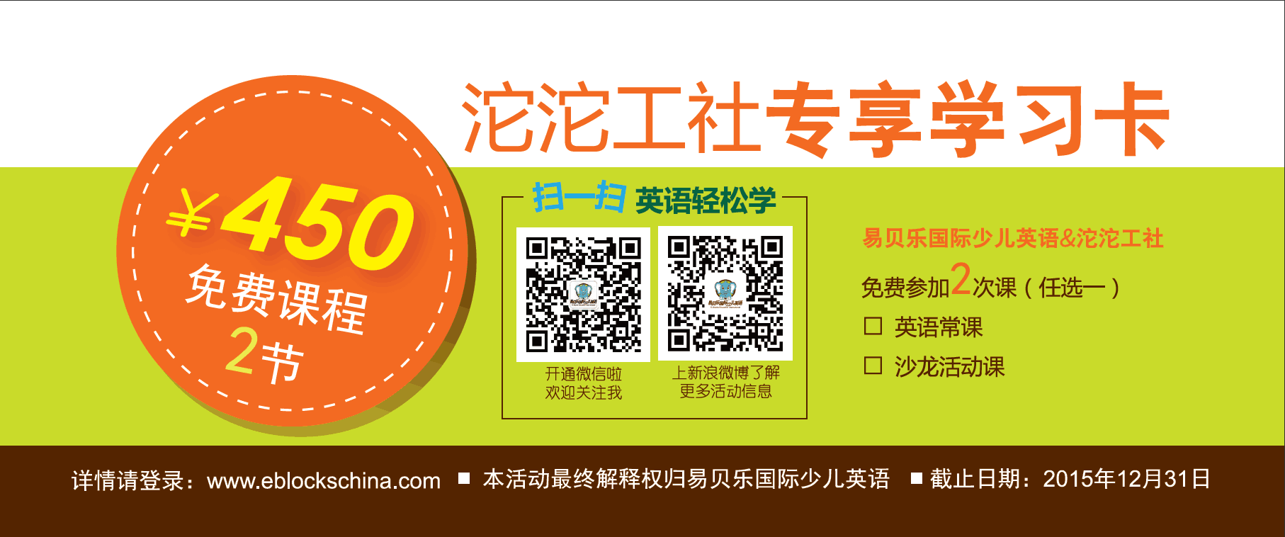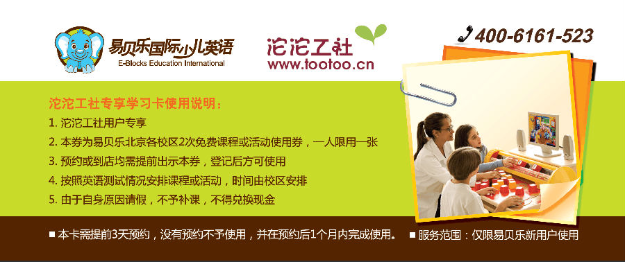 易貝樂(lè)國(guó)際少兒英語(yǔ)攜手坨坨工社,為坨坨工社的會(huì)員送上專享學(xué)習(xí)卡(價(jià)值450元)!